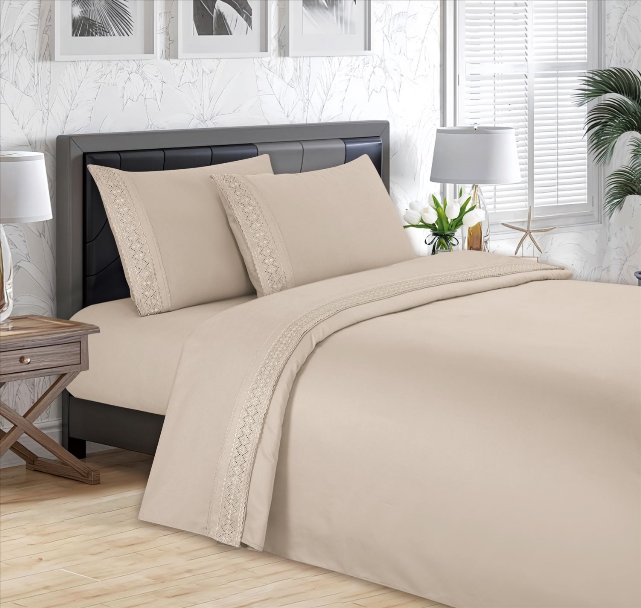 Sábanas elaboradas con 3000 hilos. Con un toque delicado y elegante en el borde de la sábana superior y en las fundas de almohada.